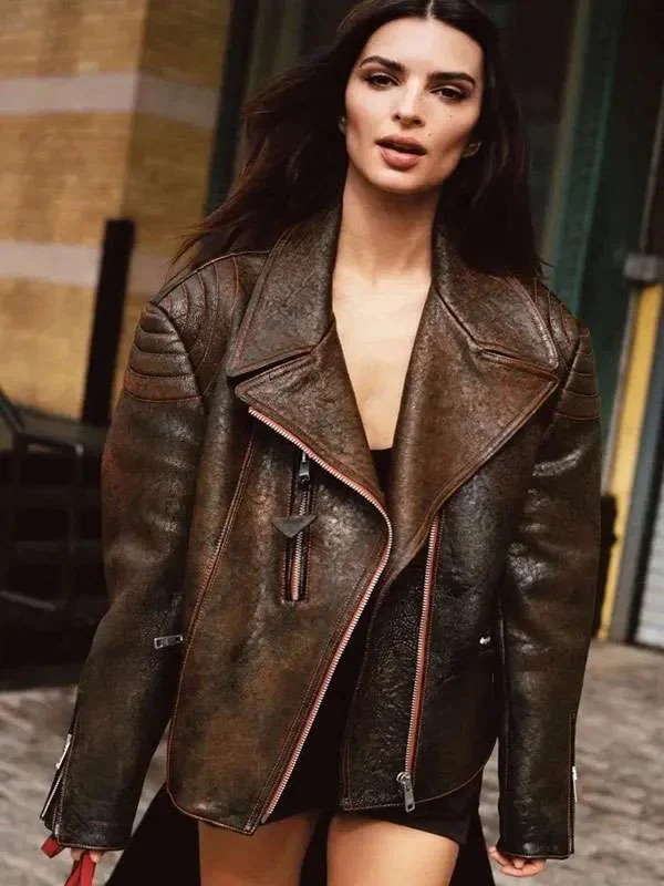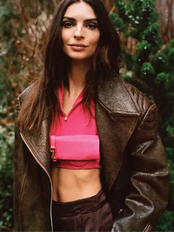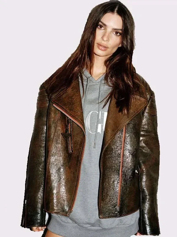 Emily Ratajkowski Brown Distressed Leather Jacket